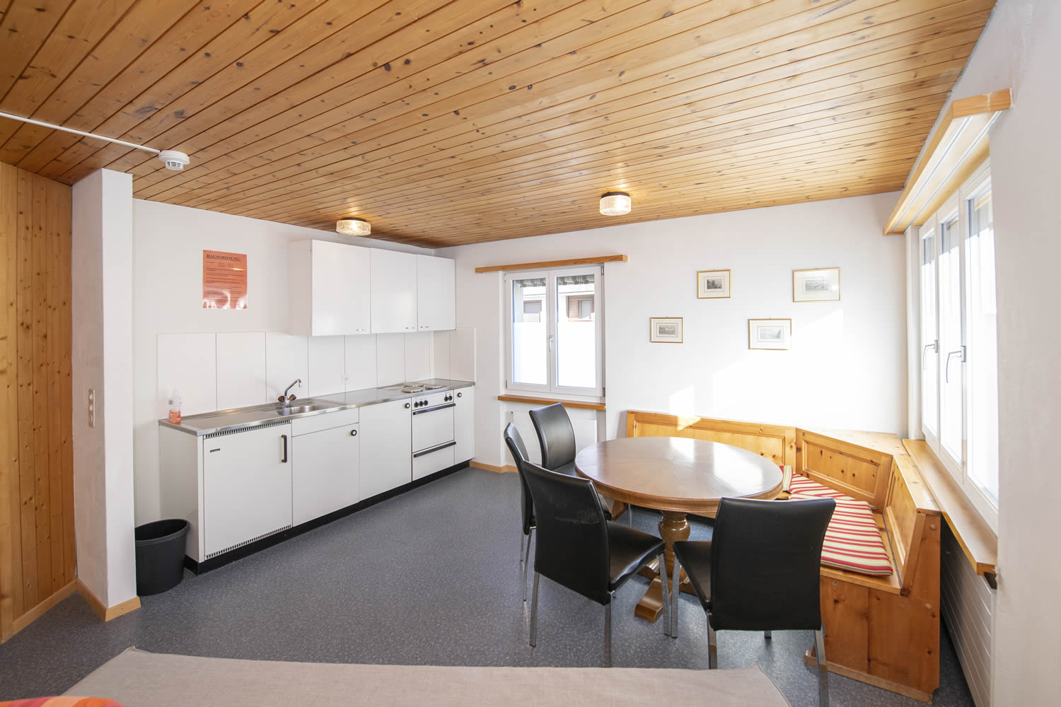 2 Kombi-Steamer, 4 Kochfelder, 2 Kühlschränke, Gastro-Gehring Abwaschmaschine, Tiefkühltruhe, grosser und freundlicher Essraum mit 56 Sitzplätzen, Beamer, Leinwand, DVD-Player, Gemeinschafts-WC, Separater Schuh- und Ski-Raum, Gratis WLAN Benützung